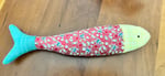 Delight your feline friend with our handmade Catnip Sardine Cat toy, measuring 9 1/2 inches x 2 inches and featuring a vibrant design in turquoise, red print and yellow gingham. Each Sardine is stuffed with a puffy poly filling and premium fresh dried catnip to entice hours of play and pouncing. Perfect for batting around cuddling, and carrying, this colorful catnip toy keeps kitties happily entertained while adding a splash of charm in your home. Ideal for cats of all ages who love to chase and snuggle their toys.